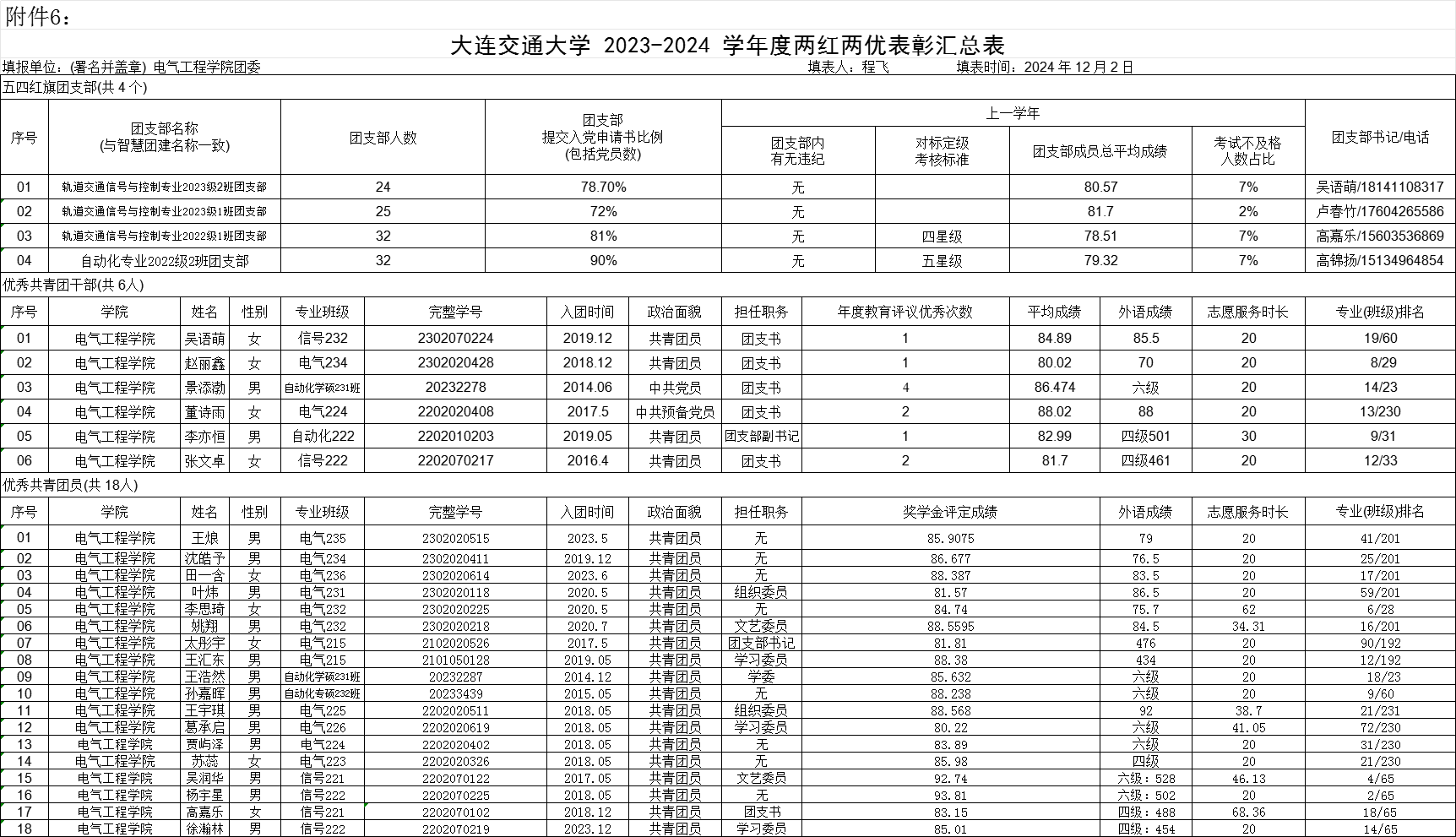 根据学校团委《关于评选 2023-2024 学年五四红旗团委、五四红旗团支部、优秀共青团干部、优秀共青团员的通知》要求,经各年级申报推荐,学院团委综合评审产生拟推报参评学校五四红旗团支部、优秀共青团干部、优秀共青团员名单,现将名单予以公示: